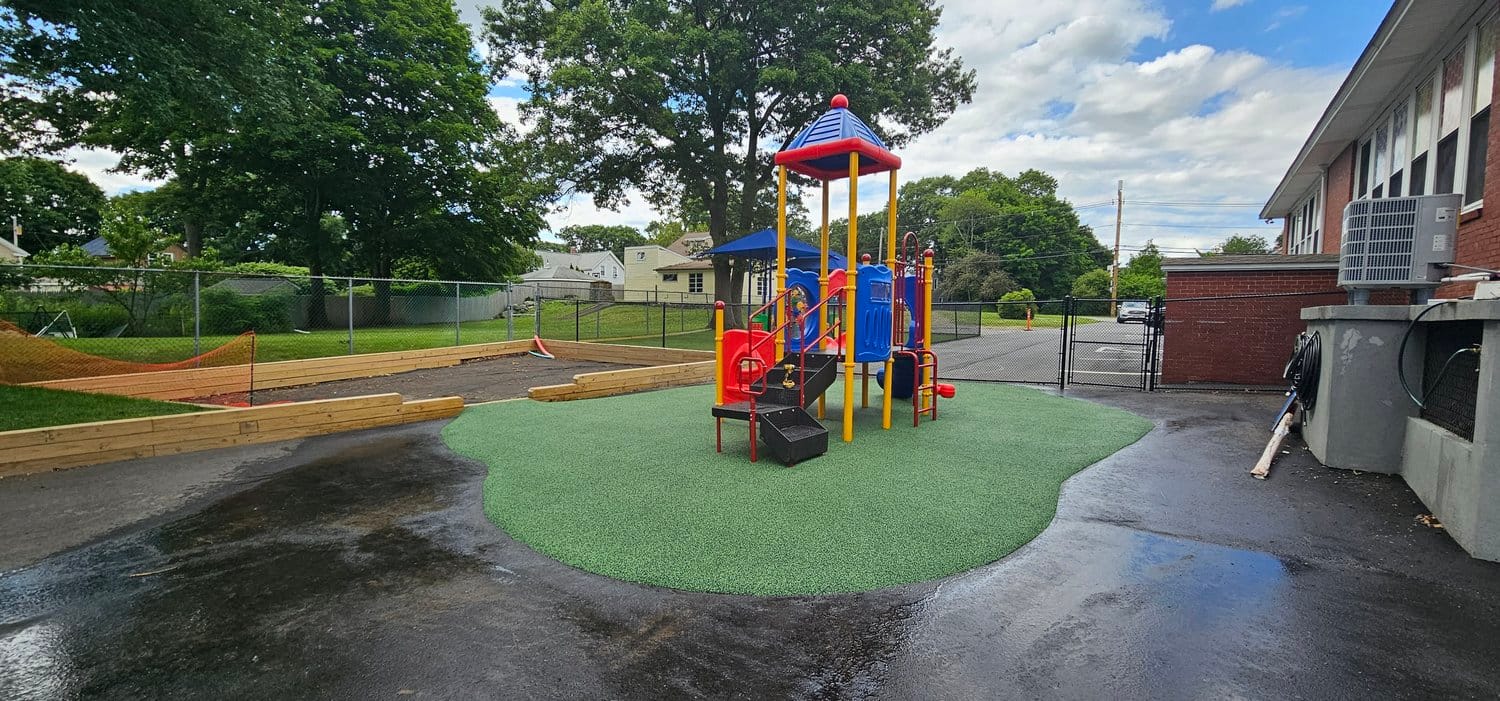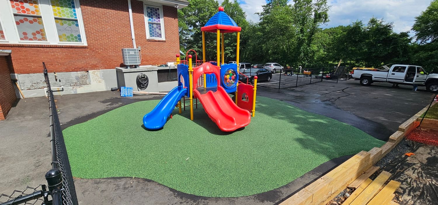 Premier Park & Play installed rubber playground surfacing for Second Home Child Care: a 2/3 green and 1/3 black blend applied to meet industry safety standards in a fun geometric shape. I am happy with the work. The crew that came out was excellent. Crew lead was great on communication and worked efficiently to get this done just in time for the event. I would highly recommend. Thank you for everything in this project! ~ Whitney, Second Home Child Care Owner