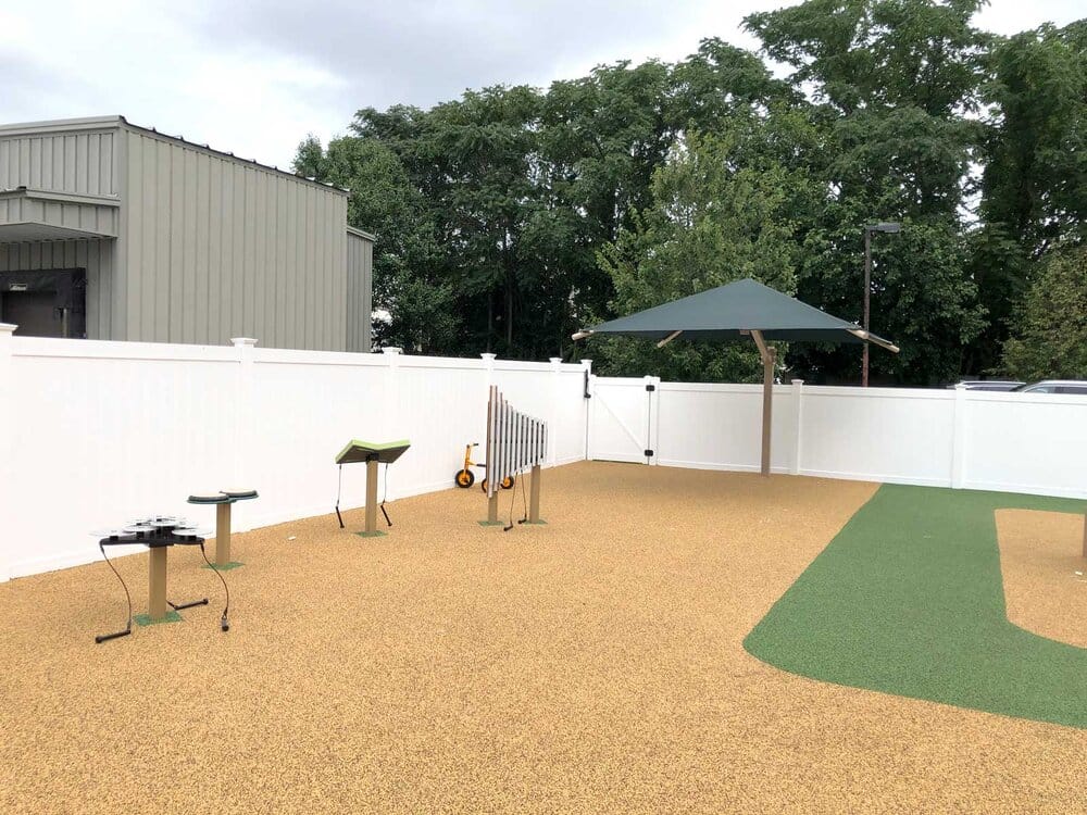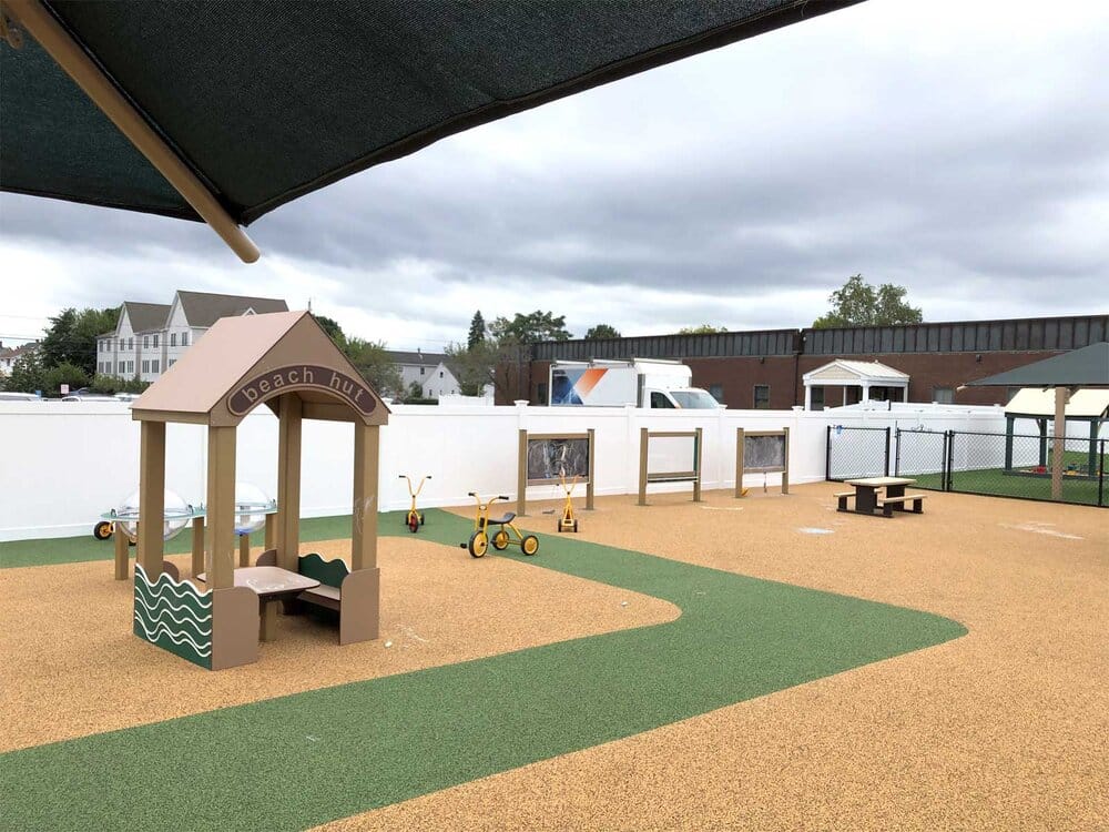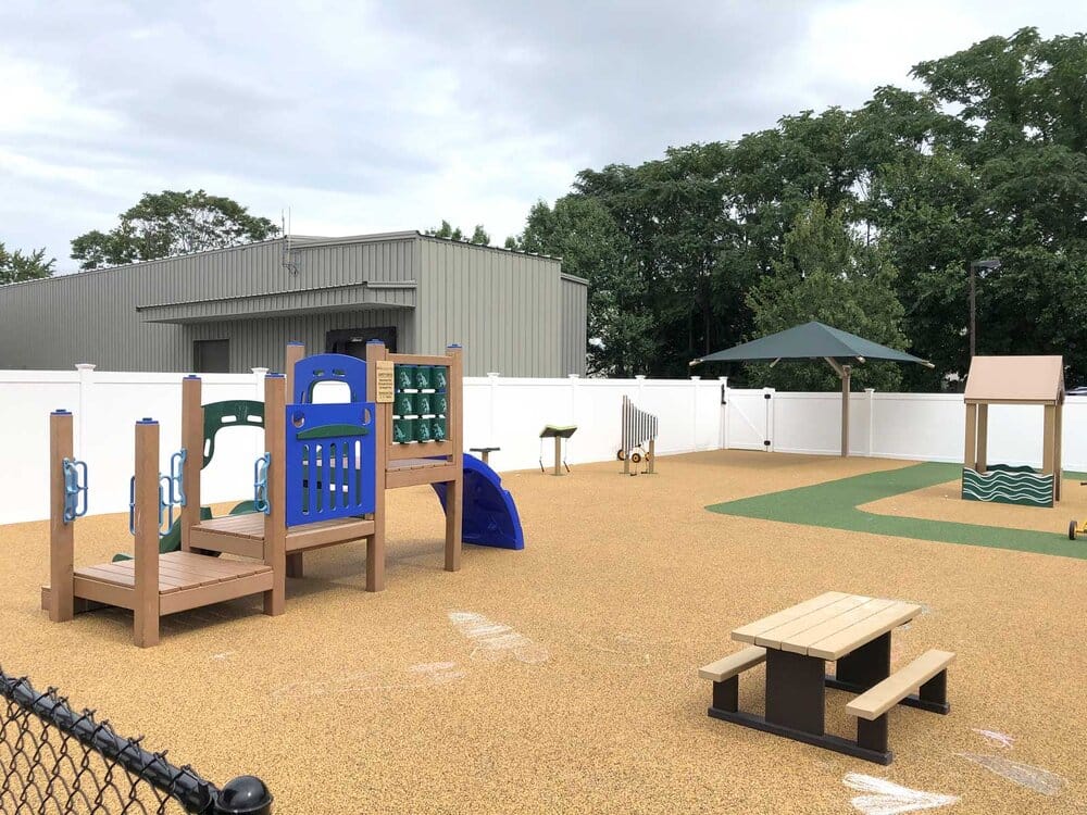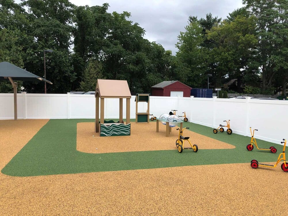 The daycare playground at Southern New Hampshire Services showcases our owner Dougs expertise in transforming an old playground into something completely new. For the poured rubber surface he designed a trike path and turf field. The surface complements playground equipment from Nature of Early Play which is specially designed for small children and worked perfectly for this project. The installed equipment includes play structures, play houses, art panels and a music garden. There are shades as well as a picnic table.