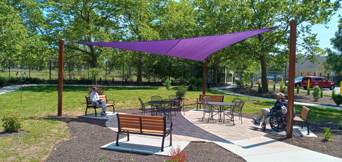 The addition of this shade sail, as supplied by Superior Recreation Products, is a welcomed amenity by the members of The Towers at Tower Lane Retirement Community. This shade sail is the final touch on this picture perfect seating area and allows members to enjoy the scenic grounds at all hours of the day. The purple sail is stunning and brings color and youthfulness to this setting. Premier Park & Play supplied and installed this equipment.